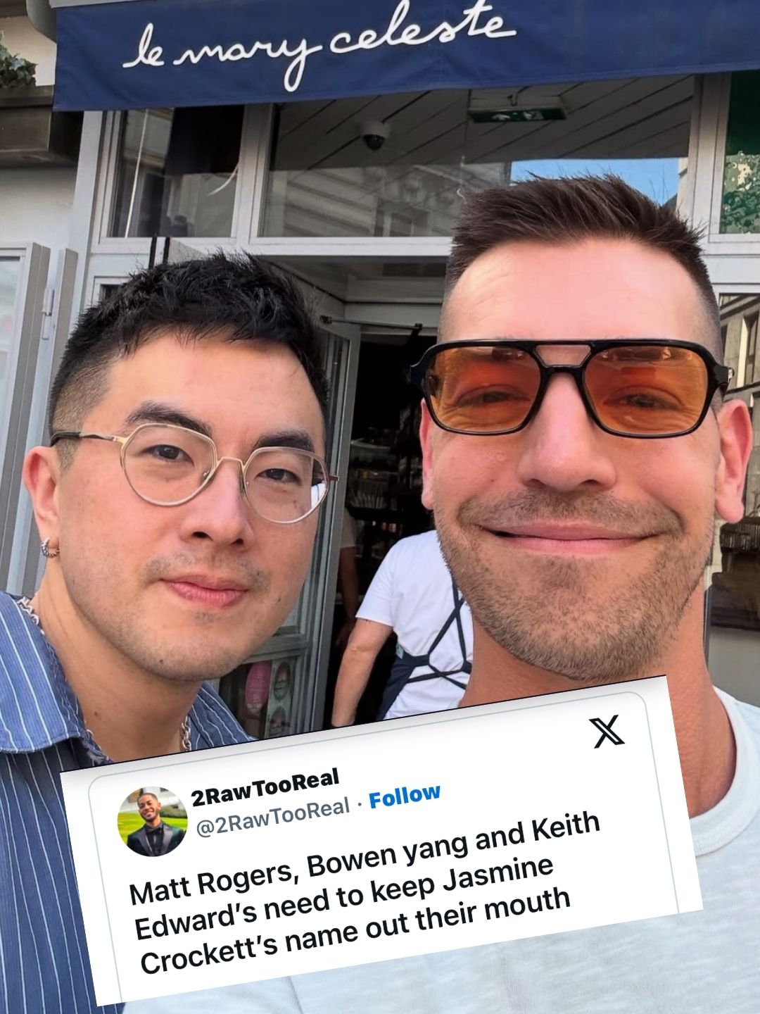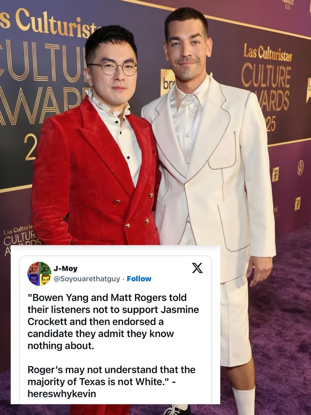 Comedians and podcast hosts Matt Rogers and Bowen Yang found themselves trending this week after they told listeners of their popular podcast Las Culturistas that they believed people should *not* donate money to Texas Representative Jasmine Crockett’s U.S. Senate campaign.